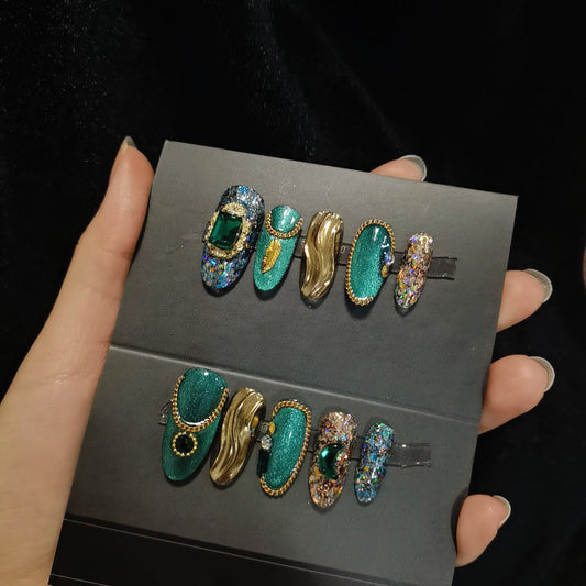 Handmade Emerald Green Cat Eye Luxury Jasmine Princess Press-on Nail Art | ZAKAPOP